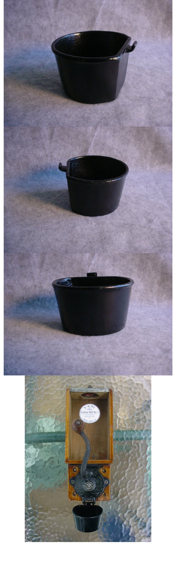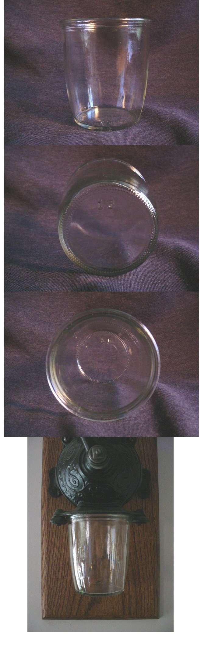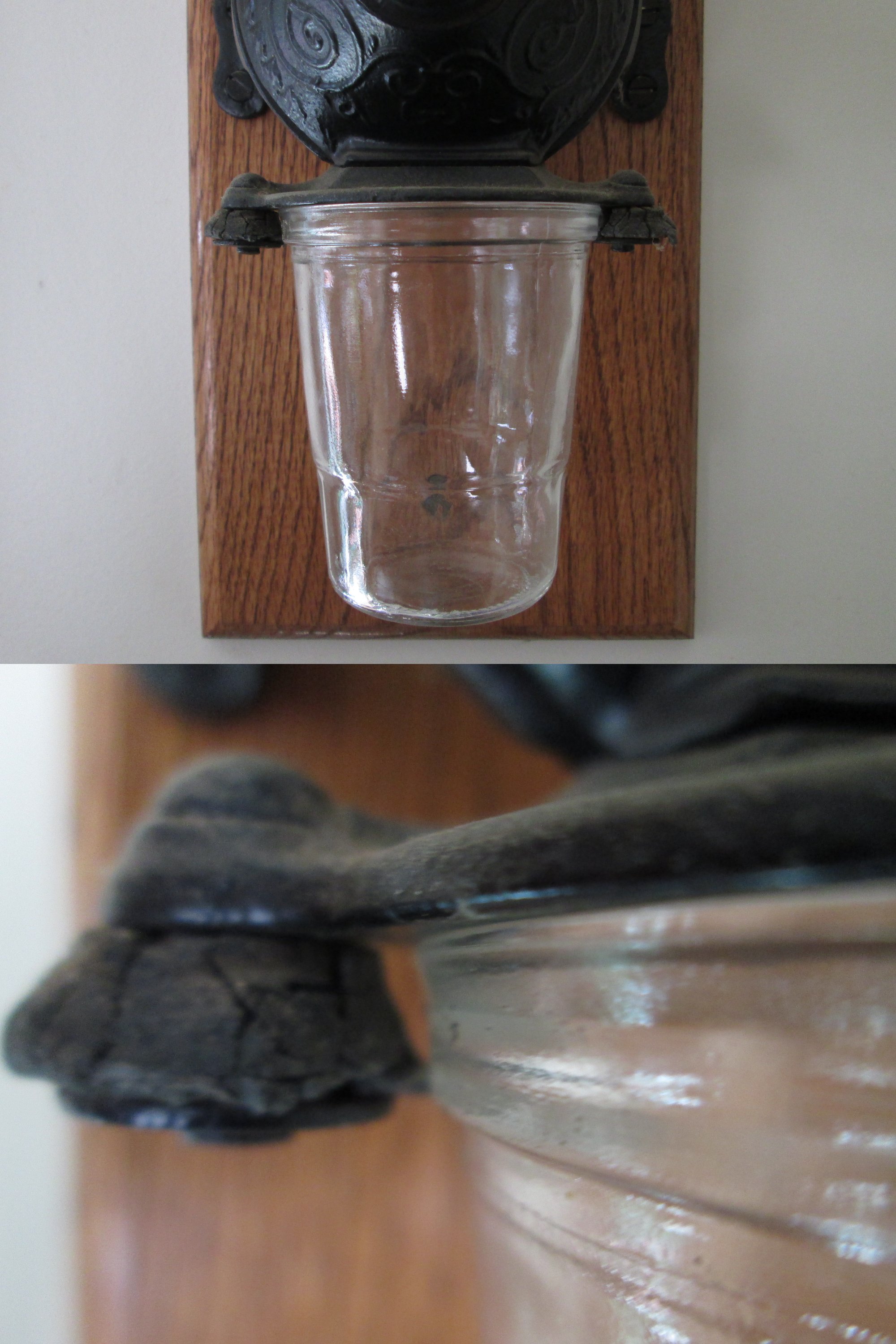 I always have people asking me about the availability of the glass hoppers for the wall mount coffee mills. I usually don't have any to spare as I would be giving up the chance to put together a complete grinder for myself. The cast iron bodies are fairly plentiful, but the glass hoppers are one of the parts that was frequently broken. I know of no replacements currently being made and it's not something you can pick up at Wally World so their value is almost the same as a complete grinder. |