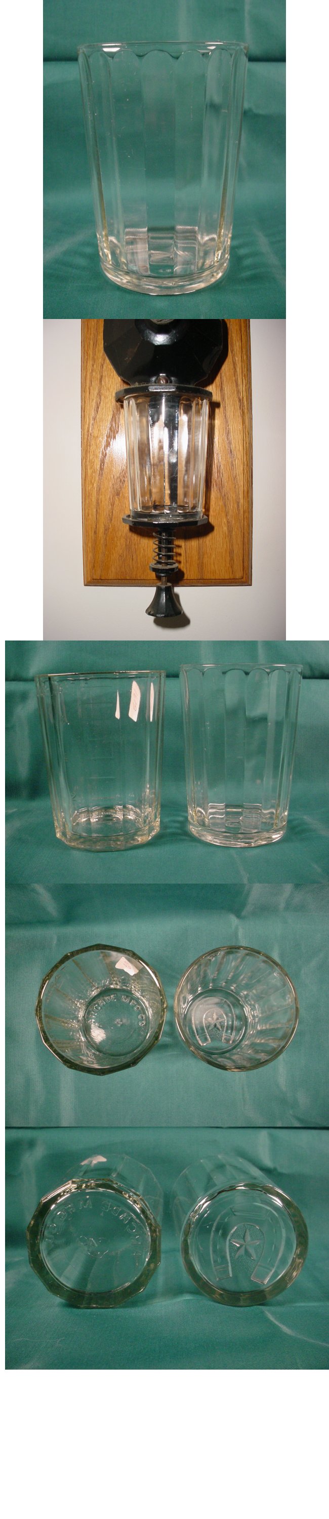 | The horseshoe and star tumblers were manufactured by many different companies mostly in and around Indiana starting just after 1900 and were produced until at least the 1930's. As far as I know they were never produced as catch cups for coffee grinders, but over the years many have been put together or married with coffee grinders as they closely resemble the originals in size and style. |