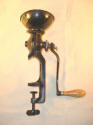 This table mount mill was manufactured by Landers Frary and Clark just after the turn of the century. It features a cast iron body and a sheet metal hopper. It is in very good original condition with the original label being almost 100% intact. The only thing to report are some minor dents and paint chips around the rim of the hopper. It was disassembled, cleaned and the interior parts were wire brushed to like new condition so it's ready to use. Item No. 3879  |