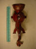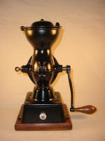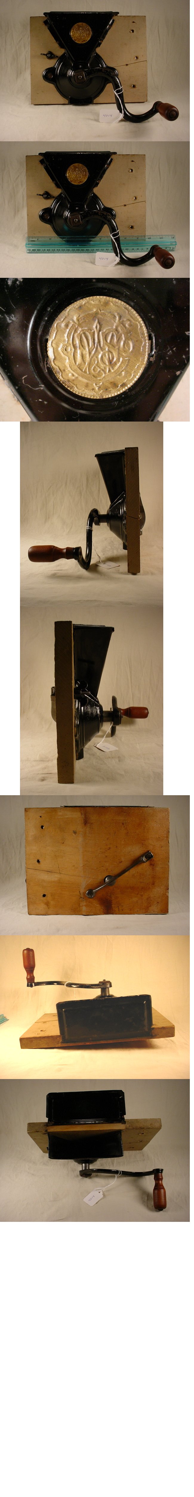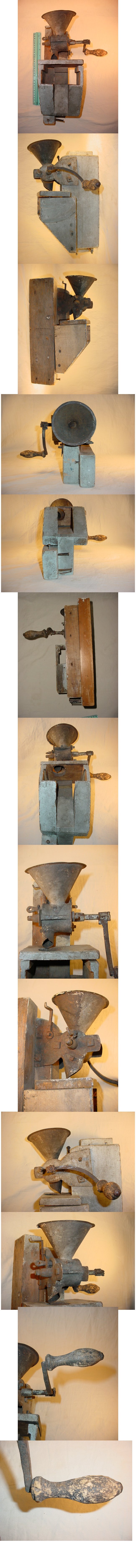 These rare hand wrought mills are attributed to Jonathan Barnes, an iron founder who worked in New England around 1750. This mill is in "as found" condition, meaning that I have done nothing other than to dust it off. This mill differs from most in that they are usually found with only a mounting post attached. Somewhere along the line an addition was made to this mill that allowed a drawer (which was not present) to be inserted and thus catch the ground coffee. This could well be the earliest American made mill to use a drawer for that purpose. The mill is in very good original condition overall. There is a screw on the left side that was used to adjust the grind. The grinder itself rotates freely but the wooden handle does not rotate on it's shaft (I don't believe it was supposed to). The wooden handle appears to have some insect damage on one side and the top piece of wood that the dispensing spout goes through has sprung up somewhat on the right hand side. There a missing nut on one of the mounting bolts. There are original hand wrought square nails used throughout with large nails going through the main mounting board. The longest one of the mounting boards is approximately 14" long and the hopper is about 4 1/2" across. Although it would work, I do not recommend using this mill to grind your beans at home due to it's historic significance (George Washington had a similar mill at Mt. Vernon). Item No. 4020  |